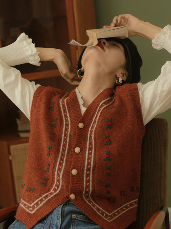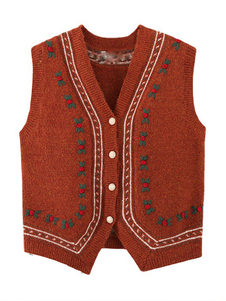 Alani Vintage Embroidery V-Neck Knitted Vest-Orange