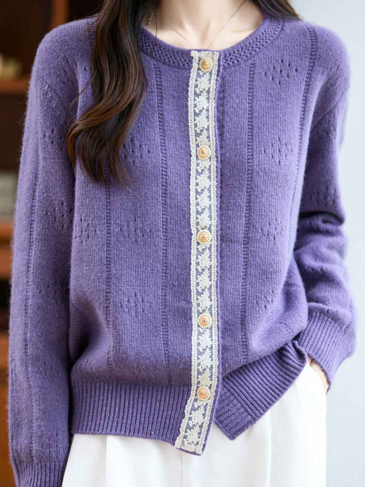 Julia Loose Crew Neck Solid Color Lace Knitted Cardigan-Orange