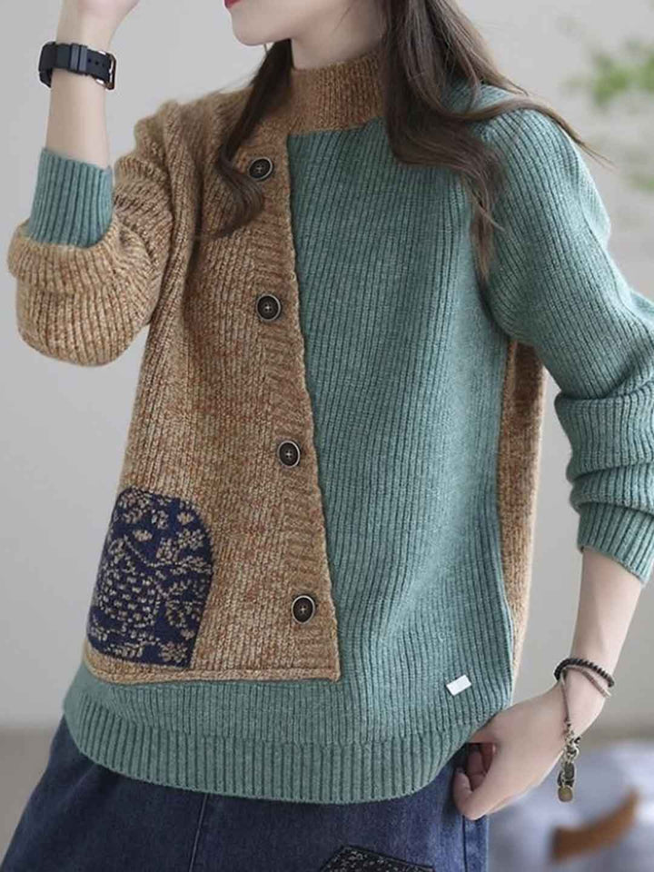 Mya Loose Crew Neck Colorblock Knitted Pullover Top-Blue