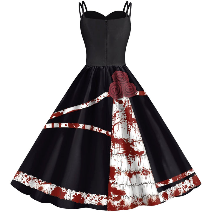 Enjoy a spooky and fun night with this Halloween dress designed for parties, cosplay, or themed events. Its sleeveless cut and wide skirt make it a comfortable and eye-catching garment, perfect for standing out at any celebration. With unique bloody style details and decorative roses, it adds a sexy and elegant touch at the same time.