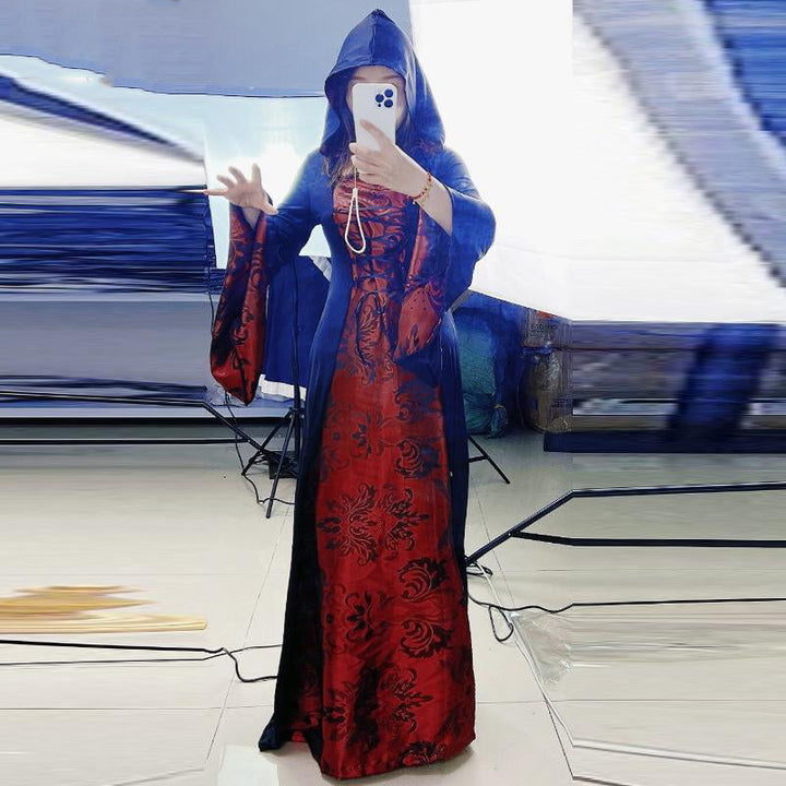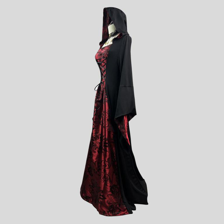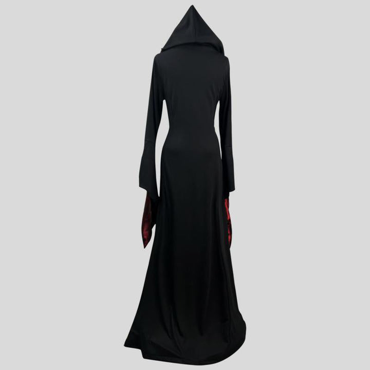 A long medieval-inspired dress perfect for themed parties, Halloween, or gothic cosplay. Its vintage design in dark tones with dramatic details creates a striking and elegant look, ideal for those seeking a bold and character-filled costume.